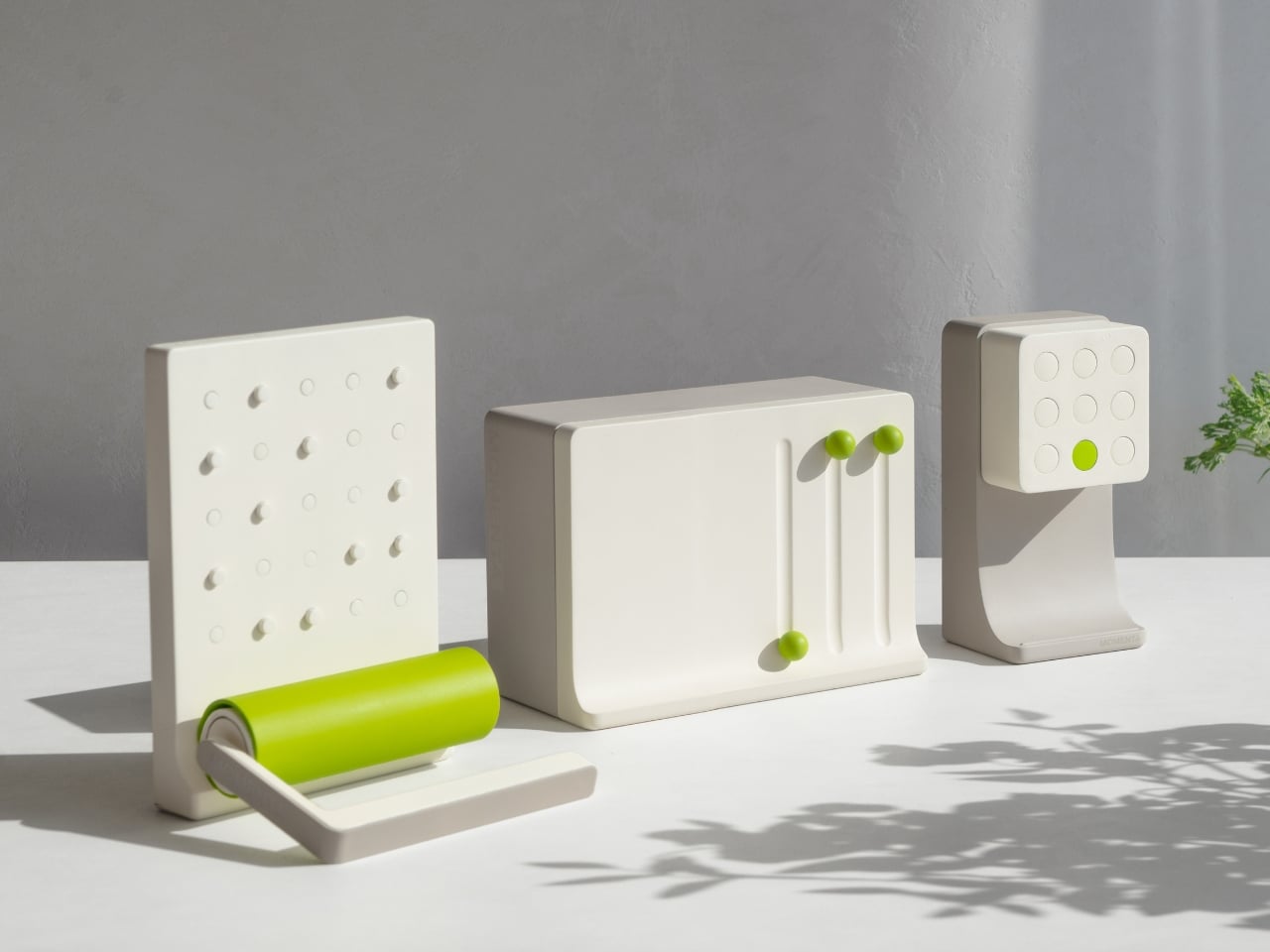 The tape cleaner is particularly striking, featuring a magnetic wall mount. At predetermined intervals, a small trigger emerges from the panel at random locations, simulating the appearance of a neglected surface. This visual cue does not chastise the user; instead, it gently encourages them to address the mess. Grasping the tape cleaner to push the trigger back in naturally leads to cleaning, making the act feel instinctual rather than forced.